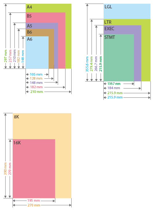 Paper size: | A3, B4, A4R, A4, B5R, B5, A5R, 11" x 17", LGL, LTRR, LTR, STMTR, EXEC, 8K, 16KR, 16K, FOOLSCAP/FOLIO, OFICIO, LEGAL (India), FOOLSCAP (Australia), F4A, LETTER (Government), LETTERR (Government), LEGAL (Government), OFICIO (Mexico), OFICIO (Ecuador), OFICIO (Argentina), LETTER (Argentina), LETTERR (Argentina), and OFICIO (Brazil) |
