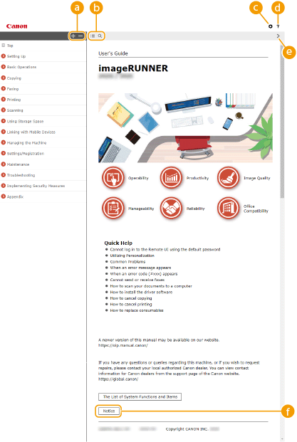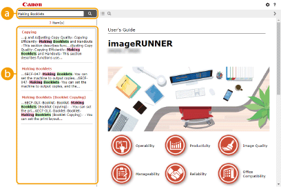Click to specify settings such as text size, layout, and display method for the User's Guide.
