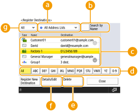 Select (e-mail), (fax), (I-fax), (file), or  (group) to filter the destinations displayed in the destination list (). Press <All> to display all registered destinations.