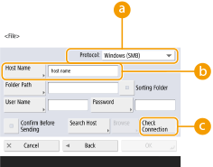 1 | Enter the host name of the file server/Advanced Box which transmits data. ![]() Ask your Network administrator about the information on the file server/Advanced Box. <Protocol>Select a protocol for the file server from <Windows (SMB)>, <FTP> and <WebDAV>. When sending a document to the Advanced Box, select <Windows (SMB)> or <WebDAV>. ![]() If you select <Windows (SMB)>, the <Search Host> and <Browse> buttons are displayed. You can easily specify a file server/Advanced Box by searching or viewing the network. You can only use <Browse> if <1.0> is set to <On> in <Specify SMB Client Version>. <Host Name>Enter the host name of the file server/Advanced Box. If you select <FTP> for protocol, enter <Host Name> as follows. When TLS is disabled Example: To save to the Shared Space: ftp://<host name>/share To save to the Personal Space: ftp://<host name>/users When TLS is enabled Example: To save to the Shared Space: ftps://<host name>/share To save to the Personal Space: ftps://<host name>/users When sending a document to the Advanced Box, enter <Host Name> as follows. If you select <Windows (SMB)> for the protocol Example: To save to the Shared Space: \\192.168.100.50\share To save to the Personal Space: \\192.168.100.50\users If you select <WebDAV> for protocol, enter <Host Name> as follows and press <Next>. When TLS is disabled Example: To save to the Shared Space: http://<IP address or host name>/ To save to the Personal Space: http://<IP address or host name>/ When TLS is enabled Example: To save to the Shared Space: https://<IP address or host name>/ To save to the Personal Space: https://<IP address or host name>/ <Check Connection>Press this button after entering the host name to confirm the connection with the file server/Advanced Box. ![]() If you are using a login service such as personal authentication management, it is necessary to enter <User Name> and <Password>. |