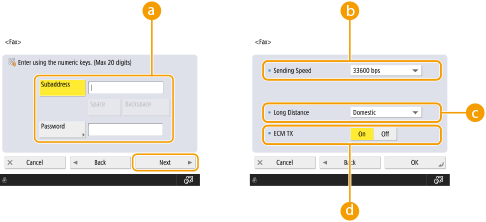 2 | Press <Set Details> and specify settings as necessary. ![]() <Subaddress>/<Password>Specify when sending or receiving documents to increase security by attaching a subaddress and password to all of your fax transactions. Basic Operations for Sending Faxes <Sending Speed>Depending on the recipient's fax machine or the status of the line, a transmission error may occur due to the transmission speed. If errors occur frequently, lower this setting value. <Long Distance>If transmission errors occur frequently when you make overseas calls, select <International (1)>. If errors persist, change the setting to <International (2)> or <International (3)>. <ECM TX>Select <On> to correct image errors. Select <Off> if the recipient's fax machine does not support the Error Correction Mode (ECM). ![]() To send faxes using ECM, it is also necessary to set <Fax Settings> <ECM TX> to <On>.![]() Although there are items you can set in the fax setting (Fax Basic Features Screen), it is convenient to set them here if you want to change the sending conditions for each destination. Set <Auto Adjust Communication Speed When Using VoIP> to <On> to send and receive faxes more accurately when the line or other party is prone to errors. If you set this to <On>, the communication speed is limited to 14,400 bps or slower, which reduces errors. |