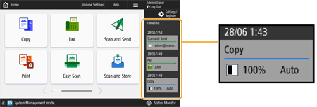 For information on the icons and items displayed in the timeline, see Items Displayed in the Timeline. A timeline can be displayed for each login user. If not logged in, a shared timeline can be displayed for users who do not use authentication, such as unauthenticated users and guest users. Change the settings for <Allow Non-Authentication Users to Use Timeline> and <Allow Each Login User to Use Timeline> according to your needs. Customizing the <Home> Screen The timeline for users that do not use authentication, such as unauthenticated users and guest users, is retained when <Quick Startup Settings for Main Power> is set to <On> and quick startup is performed. When the power is turned OFF with <Quick Startup Settings for Main Power> set to <Off> or quick startup could not be performed, the timeline for users that do not use authentication, such as unauthenticated users and guest users, is deleted. The timeline cannot be imported/exported. Importing/Exporting the Setting Data |