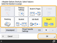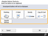The number of setting items located on the Basic Features screen and the location to be displayed differ depending on functions. A shortcut button is not displayed if <Unassigned> is set as a shortcut. The limit to the number of shortcuts for <Options> you can register is as follows. Copy: 5 Fax: 4 Scan and Send: 2 |