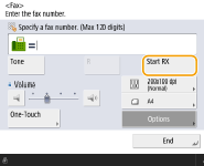 <Manual RX> ![]() | When the call is a fax An incoming call rings. Pick up the handset. If you hear a beep, select (Home) <Fax> <On-Hook> <Start RX> to receive faxes.![]() When the call is a telephone call An incoming call rings. Pick up the handset. If you do not hear a beep, start your conversation. ![]() You need to connect your telephone to the machine beforehand. You can set the machine to automatically receive faxes when an incoming call rings within a specified timeframe. <Switch to Auto RX> |