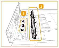 ![]() | Wipe the rollers (a total of three places) inside the separation guide. Wet a soft cloth with water and wring it out well, then wipe the rollers with it. Afterwards, wipe the rollers with a soft and dry cloth. Wait until the moisture has completely dried before proceeding to the next step. |