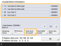 You can also check the counter information for each MEAP. Press <Check MEAP Counter> on the screen in step 2. If you press <Device Info./Other> <Check Device Configuration> on the same screen, you can check the options installed in the machine.