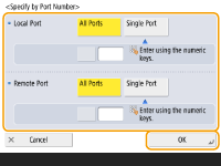 Press <Specify by Port Number> to use port numbers when specifying the ports that IPSec applies to. Select <All Ports> to apply IPSec to all port numbers. To apply IPSec to a specific port number, press <Single Port> and enter the port number. After specifying the ports, press <OK>. Specify the port of this machine in <Local Port>, and specify the port of the communication peer in <Remote Port>.