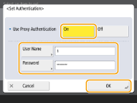 <Set Authentication>To use the proxy server authentication function, press this and configure the authentication information. On the screen that is displayed, press <On>, enter the user name and password to use for proxy authentication, and press <OK>.