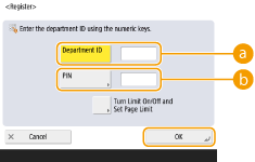 3 | Enter the Department ID and PIN, and press <OK>. ![]() <Department ID>Enter a number of 7 digits or less for the Department ID. <PIN>Enter a number of 7 digits or less for the PIN, and press <Confirm>. For confirmation, enter the PIN again and press <OK>. If you do not want to set a PIN, leave this item blank. ![]() You cannot register a Department ID or PIN consisting only of 0s, such as "00" or "0000000". Even if you enter fewer than seven digits, zeros are added to the start of the number, and a seven digit number is set. You can press <Turn Limit On/Off and Set Page Limit> to set the total number of pages that the department is allowed to use for copying, scanning, and printing. You can also make entering seven digits a requirement for Department IDs and PINs. For more information, contact your dealer or service representative. |