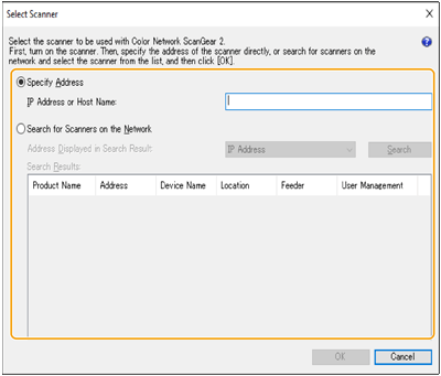 [Color Network ScanGear 2 Tool].1 | Click [Specify Address] and enter the IP address or host name of the machine in the [IP Address or Host Name] text box. |