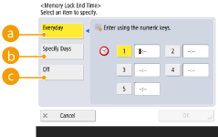 You can specify the time to deactivate the Memory Reception function. The machine will automatically cancel the Memory Reception mode at the specified time.