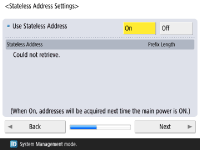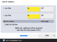Specify the settings for network connection. ![]() ![]() Press <On> for <Use IPv4> or <Use IPv6>, and press <Next>. You can also use both IPv4 and IPv6. If you press <Off> for <Use IPv4> and <Use IPv6>, and press <OK>, skip the network settings and proceed to Step 9. ![]() If you press <On> for <Use IPv4>, specify the following settings. ![]() To obtain the IP address automatically, press <DHCP> or <Auto IP>, and press <Next> or <OK>. To set the IP address manually, clear the selection for <DHCP> or <Auto IP>, press <IP Address>, <Subnet Mask>, and <Gateway Address> to enter each value, and press <Next> or <OK>. For information on the IPV4 address settings, see Setting an IPv4 Address. ![]() If you press <On> for <Use IPv6>, specify the following settings. ![]() Press <On> to use the stateless address or <Off> to not use the stateless address, and press <Next>. For information on the IPv6 address, see Setting an IPv6 Address. ![]() After specifying the stateless address, specify the following settings. ![]() Press <On> to use the manual address or <Off> no not use the manual address, and press <Next>. To use the manual address, press <Manual Address>, <Prefix Length>, and <Default Router Address> to enter each value. ![]() After specifying the manual address, specify the following settings. ![]() Press <On> to use DHCPv6 or <Off> to not use DHCPv6, and press <OK>. | |