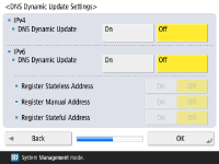Specify the DNS server address, DNS host name, and DNS domain name. ![]() ![]() Press <Primary DNS Server> and <Secondary DNS Server>, enter IPV4/IPv6 address for the DNS server, and press <Next>. For information on the settings of the DNS server address, see Making DNS Settings. ![]() ![]() Press <Host Name> to enter the name of the machine (host name). Press <Domain Name> to enter the domain name that the machine belongs to, and press <Next>. If the settings of IPv4 and IPv6 are the same, press <On> for <Use Same Host Name/Domain Name as IPv4>. ![]() ![]() To update automatically using the DNS Dynamic Update Settings, press <On> for <DNS Dynamic Update>, and press <OK>. If you set <DNS Dynamic Update> for <IPv6> to <On>, select <On> for the items to register automatically. | |