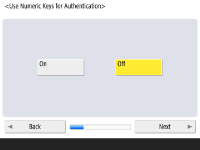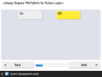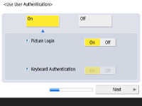To enhance the security of the machine, use the machine under a system that uses user authentication. ![]() This machine is set to use the user authentication as the login service. For more information, see Configuring the Personal Authentication Management Settings. ![]() Press <On> for <Use User Authentication>, press <On> for the login method to use, and press <Next>. If you do not use user authentication, press <Off> for <Use User Authentication>, press <OK>, and proceed to Step 5. ![]() Specify the following settings if there are no administrators besides the "Administrator" user registered in the machine. ![]() To enhance the security of the machine by disabling the "Administrator" user and registering a new administrator, press <Yes>. In <Register Administrator>, enter <User Name> and <Password>, and press <OK>. Specify <E-Mail Address>, <Department ID>, and <Display Name> as necessary. For more information, see Registering User Information in the Local Device. The "Administrator" user will be disabled the next time you log in. To operate as "Administrator," press <No>. ![]() ![]() Select the timing for displaying the login screen. If you select <Display When Func. Selected>, press <Functions>, select the function to display the login screen for, and press <OK>. Also, select the setting items on the <Settings/Registration> screen to display the login screen for. If you select <Off> for <Picture Login> and <Keyboard Authentication>, press <OK>. Proceed to step 5. If you select <On> for <Picture Login> or <Keyboard Authentication>, press <Next>. ![]() ![]() To use authentication via numeric key entry only on the login screen, press <On>. If you select <Off> for <Picture Login>, press <OK>. Proceed to step 5. If you select <On> for <Picture Login>, press <Next>. ![]() ![]() Set whether to require users to enter a PIN or pattern with Picture Login, then press <Next>. ![]() ![]() When you want to use Picture Login with the machine being in an appropriate condition for the print function, press <On>. This setting enables the following: use the Forced Hold Printing function, utilize print data sent from a computer for user registration, and display by default an appropriate login screen for each individual user when that user operates the machine for printing. For more information, see Configuring the Forced Hold Printing Settings, <User Registration Method>, and <Change Default Display for Picture Login Screen>. ![]() ![]() Select the number of preset buttons on the Picture Login screen, and press <OK>. | |