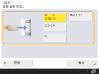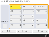 如果<始终指定>在<多功能托盘默认值>下被设为<常用纸张,则当您将纸张装入多功能托盘时,会显示屏幕让您选择“喜欢的纸张”。<多功能托盘默认值> |