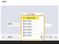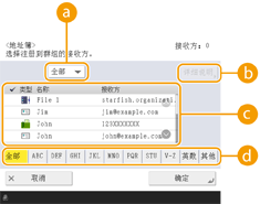 2 | 选择要在群组中注册的接收方,然后按<确定>。 ![]() 接收方类型下拉列表选择 (电子邮件)、 (传真)、 (互联网传真)或 (文件)以筛选地址列表( )中显示的接收方。按<全部>显示全部的注册接收方。 <详细说明/编辑>如果要检查接收方的设置,请选择该接收方,然后按<详细说明/编辑>。按<确定>返回前一屏幕。 接收方列表显示在步骤6中选择的地址列表中注册的接收方。从此列表中选择要在群组中注册的接收方。 ![]() 按存取号管理接收方时,只有在按<访问号>后输入存取号(限制访问地址簿中注册的接收方),接收方才会显示在此列表中。 首字母按钮选择接收方名称首字符的字母数字按钮。按<全部>显示所有注册的接收方。 <按名称检索>输入接收方名称。再次按<按名称检索>返回前一屏幕。 |