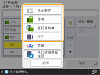 ![]() | 在单触按钮中注册一个常用接收方非常方便。这样,只需按一下按钮即可快速指定接收方。除了在单触按钮中注册传真号码或电子邮件地址外,还可以注册在存储已扫描数据时要使用的文件服务器文件夹位置(IP地址和路径)。 |