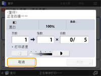 当显示“基本复印功能”屏幕时,如果按操作面板上的 (停止),复印作业会暂停,同时显示<停止选择要取消的“复印”作业。>和复印作业列表。可以从该列表中选择复印作业,然后按<取消>取消该作业。先以个人认证管理的形式登录,再按操作面板上的 (停止)注销,将显示<停止选择要取消的“复印”作业。>的信息和复印任务列表,此时该注销用户执行的最后一个任务将被取消,而其他任务将重新开始。 |