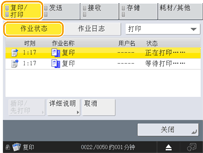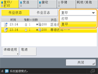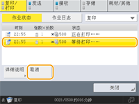 复印作业正在等待时,如果按操作面板上的 (停止),全部复印作业都会暂停,并且显示<停止选择要取消的“复印”作业。>和复印作业列表。可以从该列表中选择复印作业,然后按<取消>取消该复印作业。如果要重新开始复印,按<重新开始复印>。 |