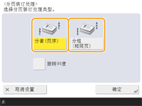 根据纸张类型,无法使用分页装订处理功能。 硬件规格 将原稿放置在稿台玻璃上时在“基本复印功能”屏幕上按<选项> <作业创建>可以使用“分套”/“分组”功能,即使将原稿放置在稿台玻璃上也是如此。分组输出时在各页之间插入作业分隔页如果选择<分组(相同页)>,可以在各组之间插入作业分隔页。有关详细信息,请参阅<组间的作业分隔页>。<组间的作业分隔页> 配置<访问已存储文件>中的设置时仅可在打印PDF/XPS文件时使用分页装订功能。 |