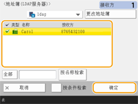 选择所需接收方,然后按<详细说明>。要从指定的接收方中删除某个接收方,按<删除接收方>。当服务器机器执行“系统管理员”信息设置时 | 当客户端机器执行“系统管理员”信息设置时 | 服务器机器与客户端机器在系统管理员 ID 和系统 PIN 方面匹配 | 可以使用远程地址簿/单触按钮 |