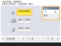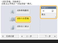 1 | 按<消除书本黑框>,然后选中<原稿尺寸>。 ![]() 如果<原稿尺寸>中显示的尺寸与所设置的书本尺寸不同,按<更改>选择尺寸。您只能对触摸面板显示屏上显示的原稿尺寸设置“消除书本黑框”模式。 |