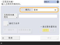 按<互联网传真地址>,输入接收方,然后按<确定>。需要以诸如“adv01@example.com”的格式指定接收方。要发送至同一网络中的设备,请以诸如“adv01@192.168.11.100 (接收方名称@IP地址)”的格式输入接收方。