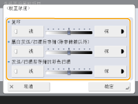 如果设置到<深>侧,将增加使用最大浓度打印的区域。如果设到<少量>侧,可能会像半色调那样打印填充的区域、文本和线条,造成点的缺失。此设置应主要用于调整中间浓度。