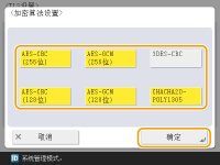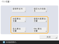 如果要使用自己生成的密钥和证书,请在生成密钥和证书后执行以下步骤。 生成用于网络通信的密钥和证书 如果要使用从证书颁发机构(CA)获取的密钥和证书,请在注册密钥和证书后执行以下步骤。 注册密钥和证书 如果将<以FIPS 140作为加密方法的格式>设为<打开>,可以使TLS通信加密方法符合美国政府批准的FIPS(联邦信息处理标准)140要求。<以FIPS 140作为加密方法的格式> 如果<以FIPS 140作为加密方法的格式>设为<打开>,当您尝试为使用未获得FIPS认可的算法(低于RSA2048位)的TLS指定证书时,将出现错误。 如果将<以FIPS 140作为加密方法的格式>设为<打开>并且发送到不支持FIPS认可的加密算法的远端一方,将出现通信错误。 如果<以FIPS 140作为加密方法的格式>设置为<打开>,<CHACHA20-POLY1305>和<X25519>会切换为<关闭>。 如果<CHACHA20-POLY1305>或<X25519>设置为<打开>,<以FIPS 140作为加密方法的格式>会切换为<关闭>。 |