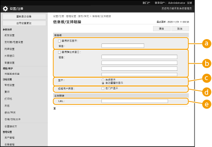 ![]() | 可以在触摸面板显示屏幕上向用户显示信息。信息可以显示在触摸面板显示屏幕的底部,也可以显示在单独的弹出式窗口中,并且可以根据信息或用户的类型选择要使用的显示方法。在弹出式窗口中显示信息时,还可以显示与“远程用户界面”门户页面上相同的信息。配置这些设置需要“管理员”权限。 |
