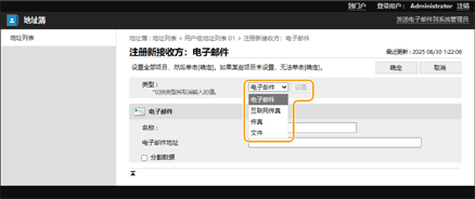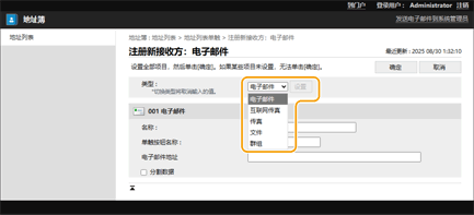 4 | 注册必要的信息并单击[确定]。 根据接收方类型,显示的项目会有所差异。有关注册信息的详细信息,请参阅在地址簿中注册接收方。 |