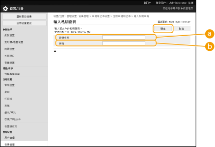2 | 输入密钥名称和密码,然后单击[确定]。 [密钥名称]使用字母数字字符输入注册到本机的密钥名称。 [密码]使用字母数字字符输入为注册文件设置的私钥密码。 |