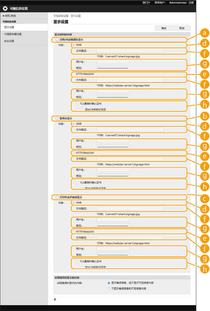 如果<登录屏幕显示设置>设置为<设备操作开始时显示>,将启用注销后显示内容的设置。要在激活自动重置模式后显示内容,请将<自动重置时间>设为1分钟或更长时间。