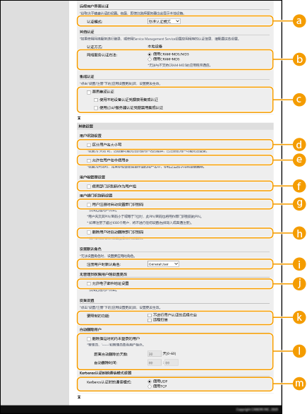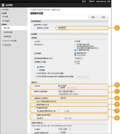 选择[使用用户认证功能]复选框,然后指定所需的设置。