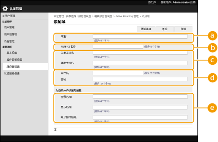 4 | 输入必要的信息。 ![]() [域名]输入登录目标的Active Directory的域名(示例:company.domain.com)。 [NetBIOS名称]输入NetBIOS域名(示例:company)。 [主要主机名或IP地址] / [辅助主机名或IP地址]输入 Active Directory 服务器的主机名或 IPv4 地址。使用辅助服务器时,在 [辅助主机名或IP地址] 中指定名称。 示例: 使用主机名:ad-server1 使用IPv4地址:192.168.18.138 [用户名] / [密码]输入用于访问和检索Active Directory服务器的用户名和密码。 [检索开始位置]指定在 Active Directory 服务器中访问和搜索的位置。 [登录名称] / [显示名称] / [电子邮件地址]为Active Directory服务器上每个用户帐户的登录名称、显示名称和电子邮件地址指定数据字段(属性名称)(示例:sAMAccountName、cn、mail)。 |