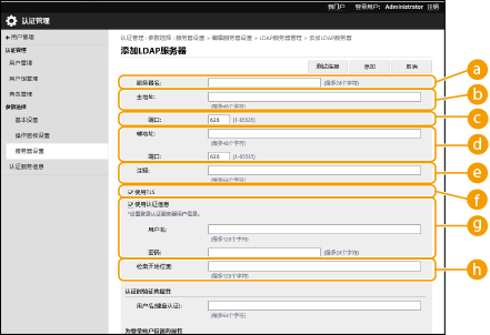 3 | 输入LDAP服务器信息。 ![]() [服务器名]输入LDAP服务器的名称。无法使用名称“localhost”。服务器名称不可以包含空格。 [主地址]输入LDAP服务器的IP地址或主机名(示例:ldap.example.com)。无法使用环回地址(127.0.0.1)。 [端口]输入用于与LDAP服务器通信的端口号。使用与服务器上配置相同的设置。如果不输入编号,选择[使用TLS]复选框时会自动设为“636”,清除复选框时会自动设为“389”。 [辅地址] / [端口]在环境中使用辅助服务器时,输入IP地址和端口号。 [注释]必要时输入描述或说明。 [使用TLS]与LDAP服务器的通信使用TLS加密时选择此复选框。 [使用认证信息]仅在LDAP服务器设为允许匿名访问时,清除此复选框才可以匿名访问LDAP服务器。使用用户名和密码进行认证时,选择此复选框并输入[用户名]和[密码]的值。 ![]() 如果选中此复选框,当想要更改 LDAP 服务器的 [主地址] 或 [辅地址] 设置时,必须输入在 [使用认证信息] 的 [密码] 中指定的密码。 [检索开始位置]指定执行LDAP服务器认证时检索用户信息的位置(等级)。 |