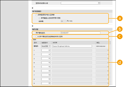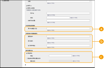 4 | 指定如何设置属性名称和域名。 ![]() [用户名(键盘认证)]为LDAP服务器上的用户名指定LDAP数据字段(属性名称)(示例:uid)。 [登录名称] / [显示名称] / [电子邮件地址]为LDAP服务器上每个用户帐户的登录名称、显示名称和电子邮件地址指定LDAP数据字段(属性名称)(示例:uid、cn、mail)。 [指定域名] / [指定域名获取的属性名称]选择如何设置登录目标的域名。要直接指定域名,请选择[指定域名],然后输入域名。要指定从中获取LDAP服务器上域名的LDAP数据字段(属性名称),请选择[指定域名获取的属性名称],然后输入属性名称(示例:dc)。 |