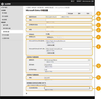 2 | 输入必要的信息。 ![]() [登录目标名称]输入登录目的地的显示名称。 默认值:Microsoft Entra ID [域名]输入登录目标 Microsoft Entra ID 的域名。 [应用程序识别码]输入应用程序识别码(客户端)。 [密钥]输入 Microsoft Entra ID 上分发的密钥。使用 [密钥和证书] 时,无需在此处输入。 [密钥和证书]使用密钥和证书时单击 [密钥和证书]。单击 [导出证书...],即可导出注册到 Microsoft Entra ID 的证书。 [Microsoft Entra ID认证URL] / [Microsoft Entra ID API URL] 输入 URL。根据您的云环境,可能需要修改 URL。 单击 [恢复初始设置] 将 [Microsoft Entra ID认证URL]/[Microsoft Entra ID API URL] 的 URL 恢复到默认值。 默认值: [Microsoft Entra ID认证URL]:https://login.microsoftonline.com [Microsoft Entra ID API URL]:https://graph.microsoft.com [登录名称] / [显示名称] / [电子邮件地址] 将数据字段(属性)名称输入到在 Microsoft Entra ID 服务器上注册了登录名称、显示名称和电子邮件地址的每个用户账户。 默认值:WindowsLogonName、displayName、mail 例如:userPrincipalName、displayName、mail [域名] 大多数情况下无需更改设置。 默认值:AzureAD [自动完成的域名] 输入自动输入的域名。无需自行输入 @ 后的域名。 |