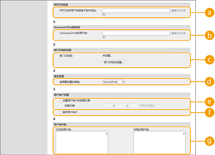 [用户组关联]要将用户指定到某个组时,从列表中选择一个已注册的用户组并单击[添加>>]。将“部门识别码”用作用户组时,不显示此设置。