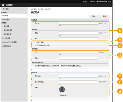 用户名为“Administrator”的用户默认注册为具有管理员权限的用户。该“Administrator”用户不能删除,但是可以在添加具有“Administrator”权限的另一用户之后将其禁用。如果“Administrator”用户禁用,则无法更改本机控制面板上仅“Administrator”用户可配置的设置。