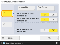 确保为本机中注册的用户设置“部门识别码”。在本地设备上注册用户信息 “部门识别码管理”仅对在本地设备上注册的用户有效。 如果您以具有管理员权限的用户登录中,系统管理员识别码和PIN会自动分配,并作为部门识别码进行管理。 |
