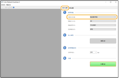 可以指定扫描的色彩、分辨率和原稿尺寸。单击[高级设置]选项卡可以执行详细设置,如原稿方向。有关详细信息,请参阅Color Network ScanGear 2的“帮助”。
