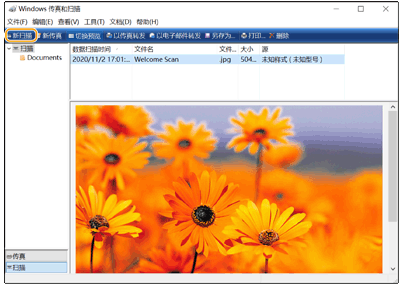 扫描完成后,已扫描的文档会显示在[Windows传真和扫描]屏幕的文件列表中,并保存到[Documents]的[已扫描的文档]文件夹中。