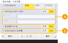 1 | 指定各个项目。 ![]() <SMTP认证(SMTP AUTH)>要使用SMTP认证,请按<打开>,在<用户名>和<密码>中输入指定邮件帐户的用户名和密码。 ![]() 用户名和密码 在转发已收到的文档时,也会使用<SMTP认证>的<用户名>和<密码>。 转发按“固定设备认证”来执行,与<用于SMTP服务器认证的信息>设置无关。(<用于SMTP服务器认证的信息>) <发送时显示认证屏幕>要在发送电子邮件和互联网传真时显示用户名和密码输入屏幕,请按<打开>。 ![]() 在设置SMTP认证时 使用下面三种方法之一来指定认证方法。 固定设备认证 在发送时输入认证信息 注册每个用户的信息 固定设备认证:使用在<SMTP认证(SMTP AUTH)>中输入的<用户名>和<密码>,并且在发送时不显示认证屏幕(登录SMTP服务器) 指定设置,如下所述。 <SMTP认证(SMTP AUTH)>: <打开> <用户名>:输入用户名。 <密码>:输入密码。 <发送时显示认证屏幕>: <关闭> <用于SMTP服务器认证的信息>: <设备设置> 在发送时输入认证信息:使用在<SMTP认证(SMTP AUTH)>中输入的<用户名>和<密码>,并且在发送时显示认证屏幕(登录SMTP服务器) 发送时,输入在<SMTP认证(SMTP AUTH)>中输入的<用户名>和<密码>作为认证信息。 若<SMTP认证(SMTP AUTH)>的<用户名>和<密码>未输入(空白),则发送时认证信息也会空白。 指定设置,如下所述。 <SMTP认证(SMTP AUTH)>: <打开> <用户名>:输入用户名。 <密码>:输入密码。 <发送时显示认证屏幕>: <打开> <用于SMTP服务器认证的信息>: <设备设置> 注册每个用户的信息:使用<每个用户的已注册信息>,并且发送时不显示认证屏幕(登录SMTP服务器) 执行SMTP认证时,使用在本地设备中注册的用户名和密码。 指定设置,如下所述。 <SMTP认证(SMTP AUTH)>: <打开> <发送时显示认证屏幕>: <关闭> <用于SMTP服务器认证的信息>: <每个用户的已注册信息> |