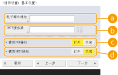 <通信设置>。1 | 指定基本设置。 ![]() <电子邮件地址>输入本机的电子邮件地址。 可以为用户名指定任何名称(@标记的左侧部分)。在@标记的右侧输入注册的主机名。 <SMTP服务器>输入SMTP服务器名(或IP地址)。 指定设置后,请检查<SMTP>的连接。 ![]() 在远程用户界面上的[使用SMTP认证(SMTP AUTH)]中指定[密码]时,如果要在[SMTP服务器]中更改和注册服务器地址,则需要在[使用SMTP认证(SMTP AUTH)]中的[密码]中输入密码。 <使用POP接收>如果要使用POP3服务器接收电子邮件/互联网传真,请按<打开>。 <使用SMTP接收>如果希望将本机用作接收电子邮件和互联网传真的SMTP服务器,请按<打开>。请注意,如果没有在DNS服务器上注册本机的主机名,将无法通过SMTP进行接收。 |