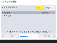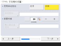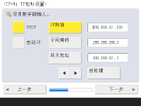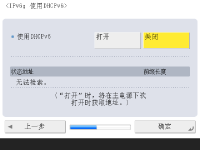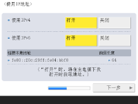 指定网络连接的设置。 ![]() ![]() 为<使用IPv4>或<使用IPv6>按<打开>,并按<下一步>。您还可以同时使用IPv4和IPv6。 如果为<使用IPv4>和<使用IPv6>按<关闭>,并按<确定>,跳过网络设置并继续执行步骤9。 ![]() 如果为<使用IPv4>按<打开>,指定以下设置。 ![]() 要自动获取IP地址,按<DHCP>或<自动IP>,并按<下一步>或<确定>。 要手动设置IP地址,清除<DHCP>或<自动IP>的选择,按<IP地址>、<子网掩码>和<网关地址>输入每个值,并按<下一步>或<确定>。 有关IPV4地址设置的信息,请参阅设置IPv4地址。 ![]() 如果为<使用IPv6>按<打开>,指定以下设置。 ![]() 按<打开>使用无状态地址,或者按<关闭>不使用无状态地址并按<下一步>。 有关IPv6地址的信息,请参阅设置IPv6地址。 ![]() 指定无状态地址后,指定以下设置。 ![]() 按<打开>使用手动地址,或者按<关闭>不使用手动地址并按<下一步>。 要使用手动地址,按<手动地址>、<前缀长度>和<默认路由器地址>输入每个值。 ![]() 指定手动地址后,指定以下设置。 ![]() 按<打开>使用DHCPv6,或者按<关闭>不使用DHCPv6并按<确定>。 | |