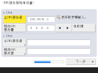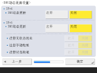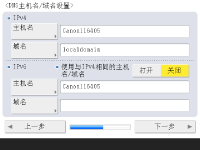 指定DNS服务器地址、DNS主机名和DNS域名。 ![]() ![]() 按<主DNS服务器>和<辅助DNS服务器>,输入DNS服务器的IPV4/IPv6地址,并按<下一步>。 有关设置DNS服务器地址的信息,请参阅进行DNS设置。 ![]() ![]() 按<主机名>输入本机名称(主机名)。按<域名>输入本机所属的域名并按<下一步>。 如果IPv4和IPv6的设置相同,为<使用与IPv4相同的主机名/域名>按<打开>。 ![]() ![]() 要使用“DNS动态更新设置”自动更新,为<DNS动态更新>按<打开>,并按<确定>。 如果为<IPv6>将<DNS动态更新>设置为<打开>,选择<打开>以便项目自动注册。 | |