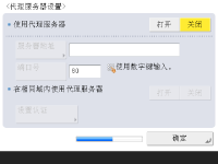 指定使用代理服务器的必要设置。 ![]() ![]() 要使用代理服务器,按<打开>、<服务器地址>和<端口号>输入每个值,并按<确定>。 如果将<在相同域内使用代理服务器>设置为<打开>,按<设置认证>指定代理服务器认证设置。 有关代理服务器设置的信息,请参阅设置代理服务器。 | |