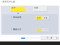 为增强本机的安全性,在使用用户认证的系统下使用本机。 ![]() 本机设置为使用身份认证作为登录服务。有关详细信息,请参阅配置个人认证管理设置。 ![]() 为<使用用户认证>按<打开>,按<打开>选择要使用的登录方法,并按<下一步>。 如果不使用用户认证,为<使用用户认证>按<关闭>,按<确定>并继续执行步骤5。 ![]() 如果除了本机中注册的“管理员”用户之外没有其他管理员,请指定以下设置。 ![]() 要通过禁用“管理员”用户并注册新管理员提高本机的安全性能,请按<是>。在<注册管理员>中,输入<用户名>和<密码>,然后按<确定>。必要时指定<电子邮件地址>、<部门识别码>和<显示名称>。详细信息请参阅在本地设备上注册用户信息。“管理员”用户将在下次登录时禁用。 要以“管理员”身份进行操作,按<否>。 ![]() ![]() 选择显示登录屏幕的时间。如果选择<选择功能时显示>,按<功能>,选择为其显示登录屏幕的功能,然后按<良好>。另外,选择<设置/注册>屏幕上的设置项目以为其显示登录屏幕。 如果对<简单登录>和<键盘认证>选择<关闭>,按<确定>。继续到步骤5。 如果对<简单登录>或<键盘认证>选择<打开>,按<下一步>。 ![]() ![]() 要只通过登录屏幕上的数字键输入使用认证,按<打开>。 如果对<简单登录>选择<关闭>,按<确定>。继续到步骤5。 如果对<简单登录>选择<打开>,按<下一步>。 ![]() ![]() 设置是否要求用户使用图片登录输入PIN或图案,然后按<下一步>。 ![]() ![]() 如果想要对于正处于适合打印功能条件的机器使用简单登录,按<打开>。此设置启用以下事项:使用“强制保留打印”,利用计算机发送的打印数据进行用户注册,在用户操作用于打印的机器时默认显示适合这些用户的登录屏幕。详细信息请参阅配置强制保留打印设置、<用户注册方法>和<更改简单登录屏幕的默认显示>。 ![]() ![]() 选择“简单登录”屏幕上的预设按钮数量并按<确定>。 | |
