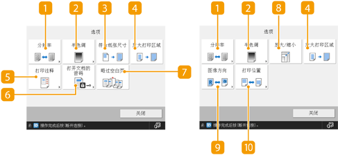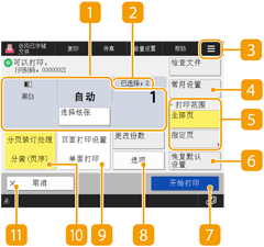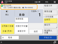 如果使用“部门识别码管理”设置了页数限制,则剩余页数会显示。有关设置“部门识别码管理”和页数限制的信息,请参阅 配置部门识别码管理设置。 仅当同时选择不同的文件类型(如PDF和JPEG)时才可以设置/更改以下功能。 选择纸张 双面打印设置 更改份数 |